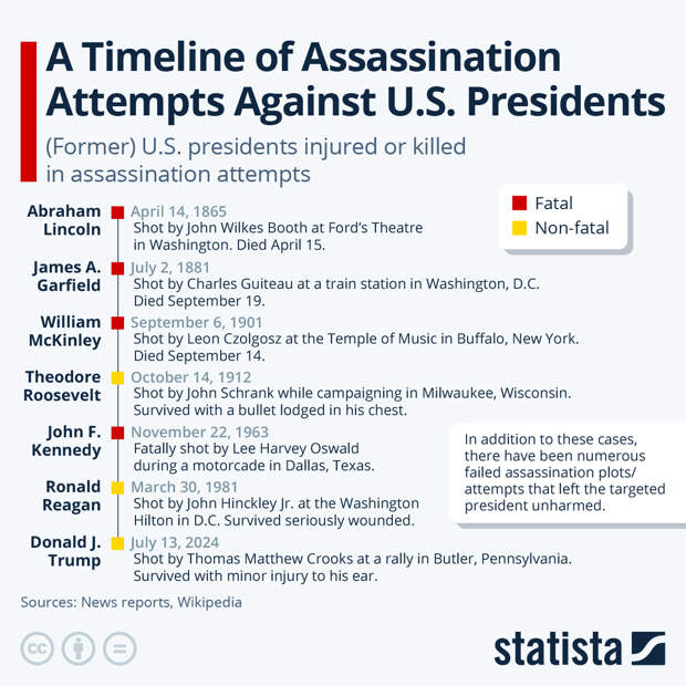 As Statista;'s Felix Richter shows in the chart below, four U.S. presidents have been assassinated while in office, with Ronald Reagan the only sitting president to survive an assassination attempt severely injured.