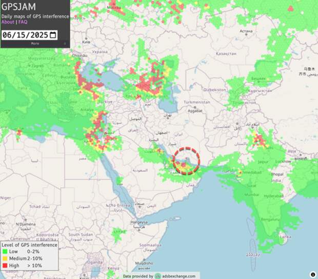 GPSJam—a site that publishes daily heat maps of GPS/GNSS disruptions affecting aircraft—shows multiple "high-interference" zones clustered around the Strait of Hormuz.