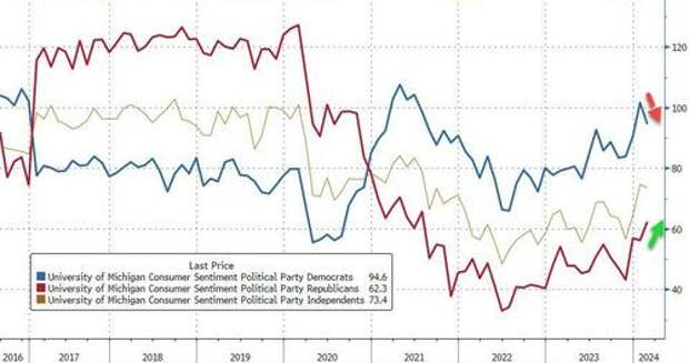 Democrats' consumer confidence tumbled in February, falling 7.1 pts (from 101.7 to 94.6) - the most since June 2022. At the same time, Republicans' confidence rose to its highest since July 2021...