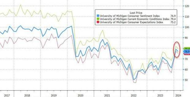 Finally, despite of continued strength in many stock market indicators, stock owners reported declines in sentiment, while for non-owners sentiment rose 5%.