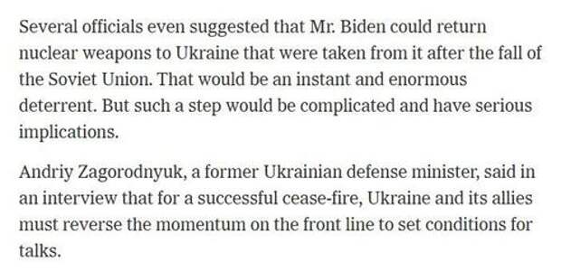 The article continues, "Several officials even suggested that Mr. Biden could return nuclear weapons to Ukraine that were taken from it after the fall of the Soviet Union."