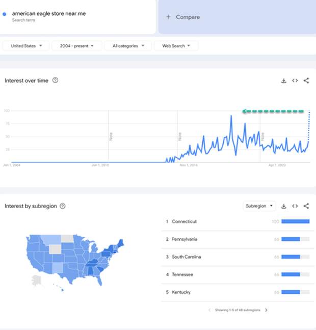 Google search trends reveal consumers are in a full-blown frenzy, desperately searching for "American Eagle store near me" in response to the viral ad.