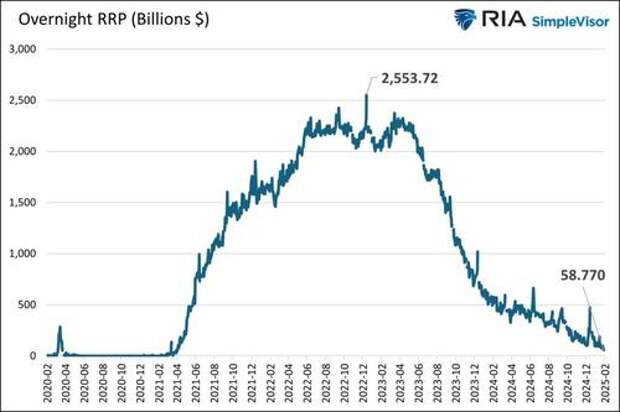 The program allows banks and money markets to lend money to the Fed, and in exchange, the Fed provides them with risk-free Treasury collateral. The “risk-free” money market surrogate effectively met the massive demand for short-term investments and kept rates positive.