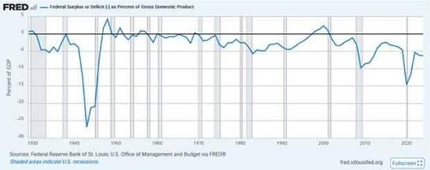 In the pandemic crisis of March 2020, the Federal Reserve and the government opened the liquidity floodgates to combat the shuttering of the global economy. As we share in the first graph below, courtesy of Longtermtrends, in 2020, the percentage growth of M2 money supply (black) grew at a higher rate than at any time in history. The second graph shows that deficit spending as a percentage of GDP was 15% in 2020. The only time since 1930 it was higher was during World War II.