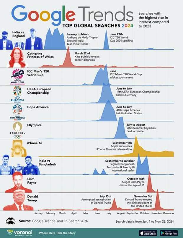 This graphic visualizes the top 10 trending Google searches worldwide in 2024.The top trending searches were those with the highest increase in search interest compared to 2023.