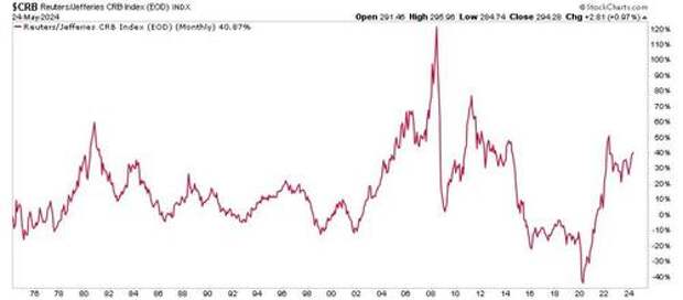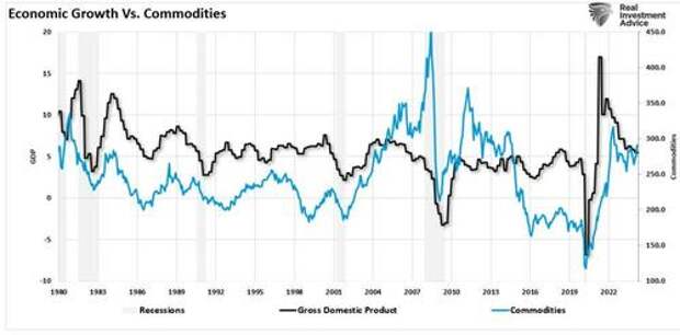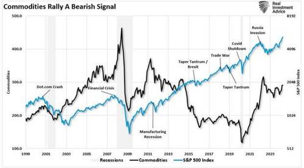 Commodities, and hard assets in general, can be an exhilarating and profitable ride on the way up. However, as shown in the long-term chart above, that trade tends to end badly. Commodities have repeatedly led market downturns and recessions.