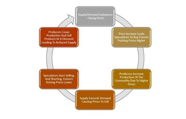 Wall Street speculators begin to sell their futures contracts as prices decline, pushing the price lower. As prices fall, more speculators dump their contracts and sell short orange futures contracts, causing prices to fall further.