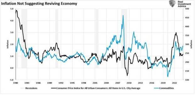 There is also a high correlation between commodities and inflation. It should be self-evident that when commodity prices rise, the cost of goods and services also rises due to higher input costs. However, the price increase is constrained as consumers are unable to purchase those goods and services. As noted, the consequence of higher prices is less demand. Less demand leads to lower prices or disinflation.