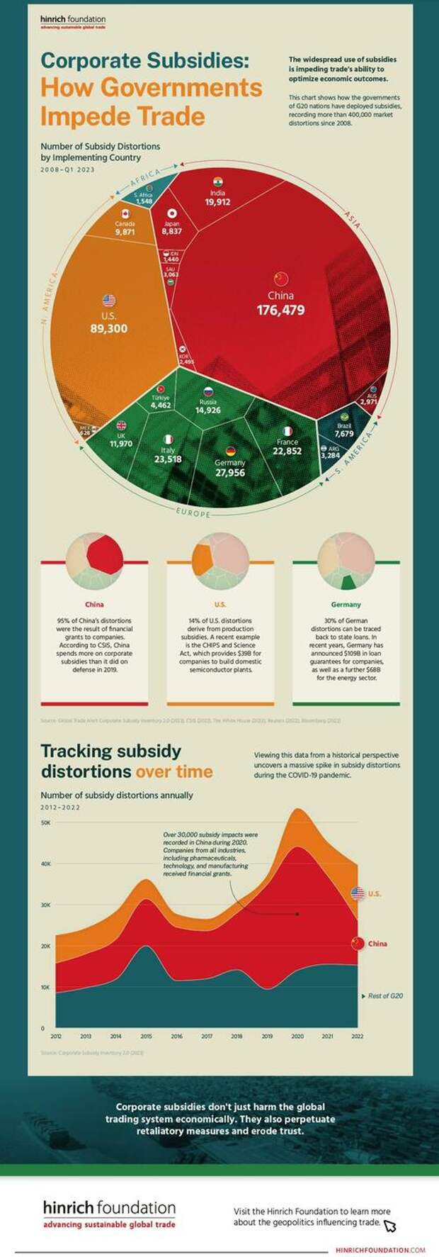 While corporate subsidies can have positive effects on a country’s economy, they can also create an uneven playing field in the global market.Visual Capitalist's Marcus Lu and Miranda Smith use the graphic below, from the Hinrich Foundation, to visualize the impact of the G20’s use of corporate subsidies, from 2008 to Q1 2023.