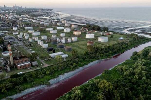 The Sarandí stream that winds through the dense outskirts of Buenos Aires, Argentina, has recently turned blood red, leading to fears of a potential industrial chemical leak.
