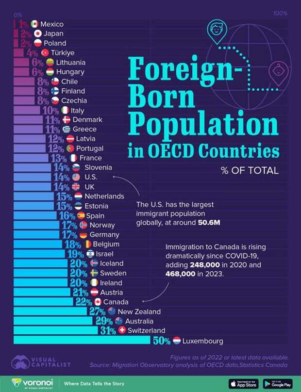 This graphic, via Visual Capitalist's Marcus Lu, measures diversity across OECD countries by their percentage share of foreign-born population.