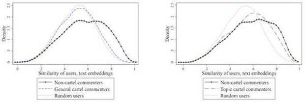 Figure 2 Probability density of authors’ similarity to commenters and random users in general cartels (left) and topic cartels (right)