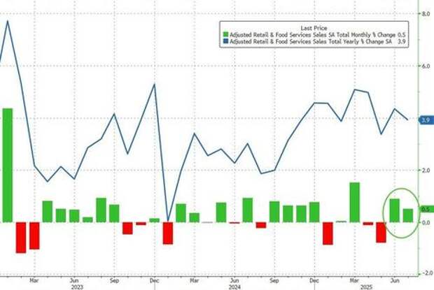 6% exp), but, perhaps some credence remains for BofA's team as June's 0.6% rise was revised up to a 0.9% MoM jump. This is the second bigly month of retail sales gains with sale sup 3.9% YoY...Source: Bloomberg