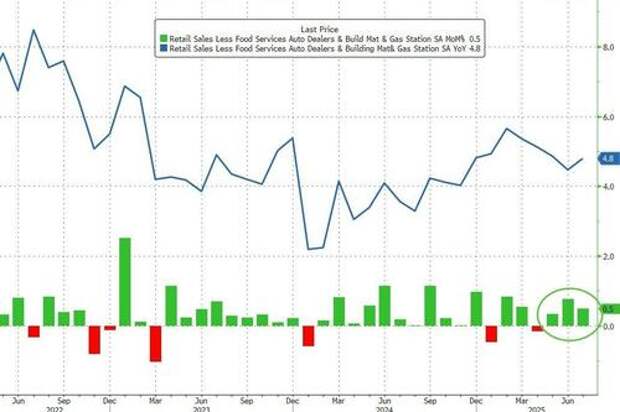Core retail sales, ex Autos and Gas, rose jst 0.2% MoM (buit also followed a large upward revision) with the Control Group Sales (which slides into the GDP calculation) rising 0.5% (better than the expected 0.4%) and also seeing June revised up significantly. This leaves YoY sales up 4.8%...