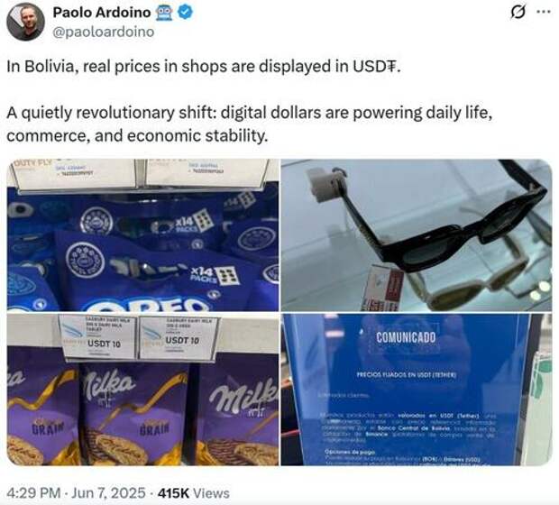 In a Saturday X post, Ardoino shared images of items being priced in USDt in Bolivia, including sunglasses and sweets. One photo showed a notice to customers that prices were set in USDT: