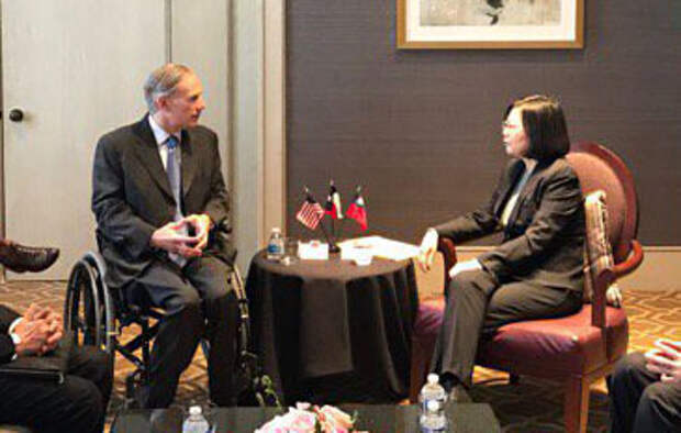 A photograph tweeted by Texas Governor Greg Abbott shows him meeting Tsai, with a small table between them adorned with the U.S., Texas and Taiwanese flags.