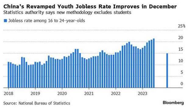 Officials even avoided acknowledging that the economy is in deflation.3. Youth unemployment data returned after a six-month halt. The 14.9% jobless rate for December still looks concerning, although it was down from a record 21.3% in June, after which authorities suspended releasing such data.