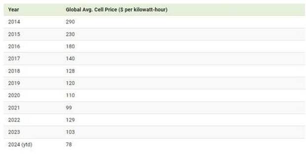 The average price of lithium-ion battery cells dropped from $290 per kilowatt-hour in 2014 to $103 in 2023.