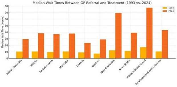 To illustrate the magnitude of rationing (and the trend), one can examine the evolution of the median number of weeks between referral by a general practitioner and receipt of treatment from 1993 to 2024. In most provinces (except one), the median wait time in 1993 was less than 12 weeks. Today, all provinces are close or exceed 30 weeks. In two provinces, New Brunswick and Prince Edward Island, the median wait times exceed 69 weeks. For some procedures, such as neurosurgery, the wait time (for all provinces) exceeds 46 weeks.