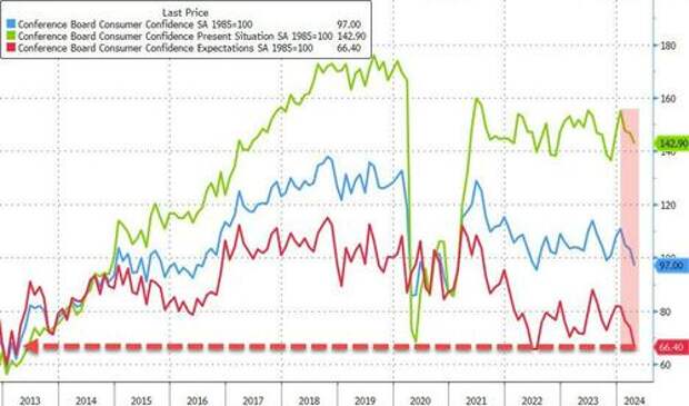 For the third straight month, The Conference Board's consumer confidence index fell in April, tumbling to 97.0 from a downwardly revised 103.1 (dramatically below the 104.0 median expectation and in fact below the lowest of all 56 analysts' estimates). Both current conditions and expectations plunged, with the latter at its weakest since