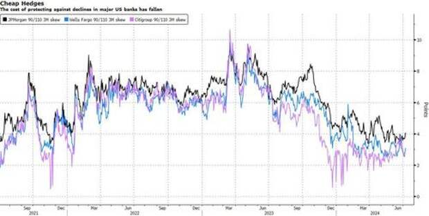 The trio of stocks has surged more than 22% this year, yet the options market is showing little concern the rally may stumble. A measure of hedging costs for JPMorgan and Wells Fargo shares is hovering near its lowest level since 2021, while protection for Citigroup is below its one-year average, according to data compiled by Bloomberg.