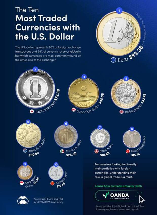 In collaboration with OANDA, this graphic, Visual Capitalist's Julia Wendling offers a clear visual breakdown of the top currencies traded alongside the USD.