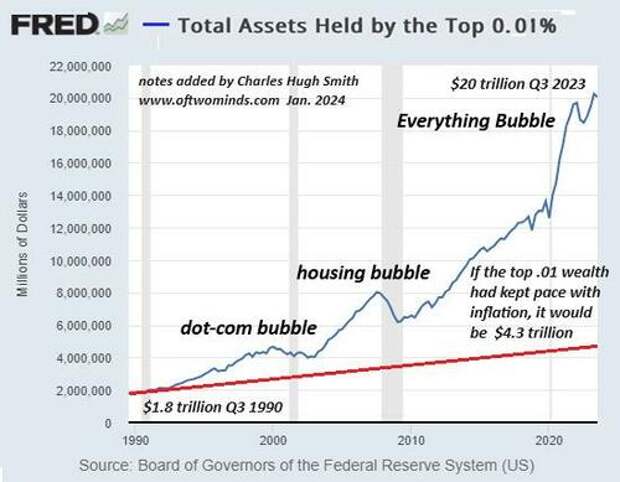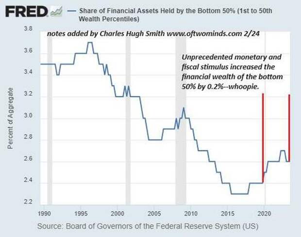 The cause wasn't extreme wealth inequality, it was a Fed policy error, blah blah blah.The reason why it's so easy to ignore extreme wealth inequality (EWI) is that we don't experience EWI as a thing, we experience a decline in our standard of living as wealth is siphoned up into the top 10%. We sense we're falling behind, that our situation is increasingly precarious, and the source of this decline seems to be inflation--a decline in the purchasing power of our earnings as prices soar--and global competition from low-cost labor.