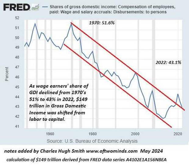 Using data from the Federal Reserve's FRED database (series A4102E1A156NBEA), correspondent Alain M. calculated the actual sum for the period 1970 to 2022 (2022 being the most recent data available) was a staggering $149 trillion: his spreadsheet is available here as a PDF: Employees Share of Gross Domestic Income 1970-2022.