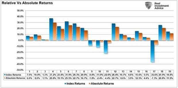 Historically, trying to beat a benchmark index leads to poor outcomes. However, understanding absolute and relative returns can help solve this issue. Notably, while most investors say they want relative returns, they want absolute returns. The problem, as we discussed in “Benchmarking Has More Risk Than You Think,” is that investors are often unaware of how much risk they are taking. To wit:“There are many reasons why you shouldn’t chase an index over time and why you see statistics such as ‘80% of all funds underperform the S&P 500’ in any given year. The impact of share buybacks, substitutions, lack of taxes, no trading costs, and replacement all contribute to the index’s outperformance over those investing real dollars who do not receive the same advantages. More importantly, any portfolio allocated differently than the benchmark to provide for lower volatility, income, or long-term financial planning and capital preservation will also underperform the index. Therefore, comparing your portfolio to the S&P 500 is inherently ‘apples to oranges’ and will always lead to disappointing outcomes.“