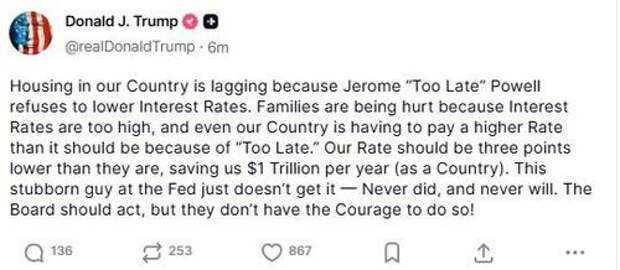 “Housing in our Country is lagging because Jerome ‘Too Late’ Powell refuses to lower Interest Rates,” Trump said in a social media post Wednesday, referring to the Fed chair.