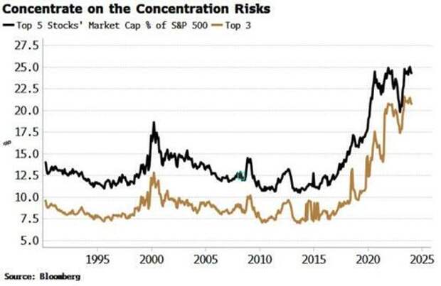 Concentration risks are at 50-year highs. The top five stocks in the in the S&P 500 now account for over a quarter of its market cap, from only about an eighth a decade ago. You have to go back to the time of the Nifty Fifty in the late 1960s and early 70s to see leadership as narrow as it is today.