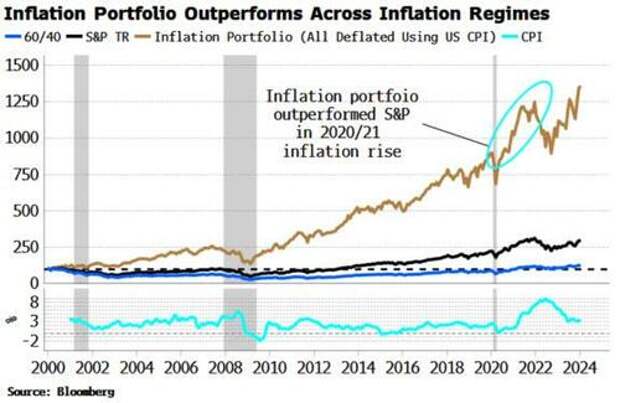 It is nevertheless reassuring to see that the portfolio does well on its backtest. It has outpaced the S&P in real terms over the last quarter century. It also outperformed in the rising inflation period during the pandemic. More generally, a strategy that went long the Inflation Portfolio when inflation was elevated, and long the market otherwise, fared better than the S&P over the last 25 years.