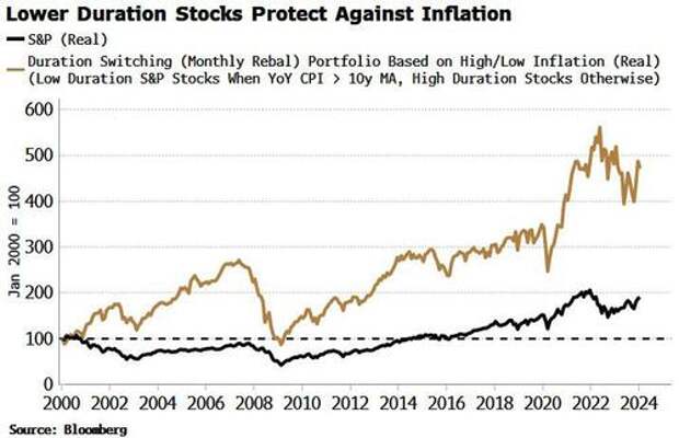 The benefits of avoiding high-duration stocks when inflation is elevated can be seen in the chart below. The blue line shows a rebalancing strategy that goes long low-duration stocks when US CPI is over its 10-year moving average, and high-duration stocks when inflation is under it (using the inverse of the dividend yield as an approximation for an equity’s duration).