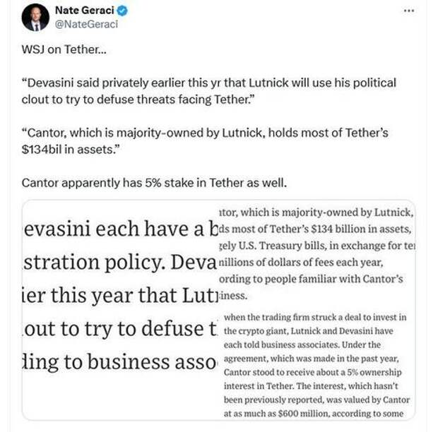 Giancarlo Devasini, suspected to be the largest shareholder of Tether, reportedly said words to the effect of: Lutnick will use his political clout to try to defuse threats facing Tether, WSJ claimed.