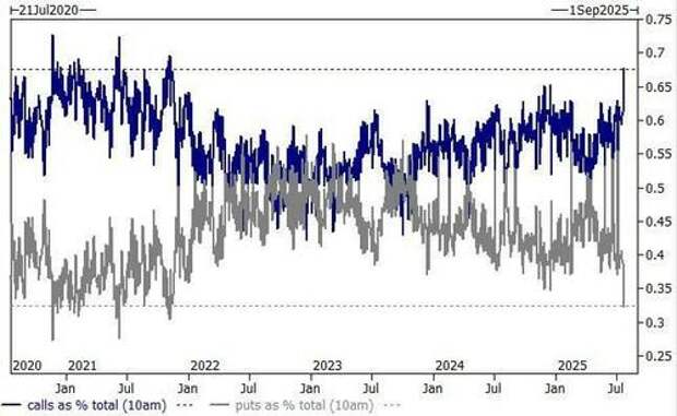 It's not just us, who are reminiscing about the insanity of January 2021: so is Goldman, and as the bank's trader Ryan Shakey wrote overnight, he is getting "2021 vibes … feels chasey out there: calls are almost 70% of the total market volume … hasn’t been this high since 2021 meme days."