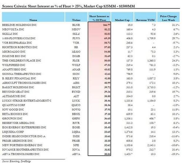 0 - by the performance of the sto(n)k market), or one can join in the insanity and at least make some money in the process.We are choosing the later, and to celebrate the lunacy we have run a Bloomberg screen of all micro and small-cap companies (market cap $10MM - $1500MM), that have a short interest as a % of float above 25%, which we believe have the highest chance of getting swept up in the next mega squeeze meltup.