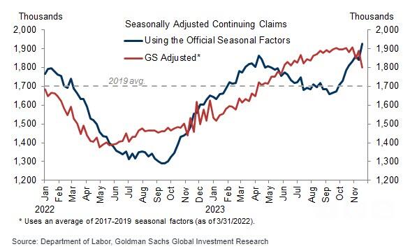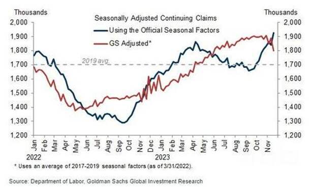 Goldman believes that seasonal distortions more than explain the 269k increase in continuing claims since early September, and expect those distortions to boost the level of continuing claims by an additional 125k by March.