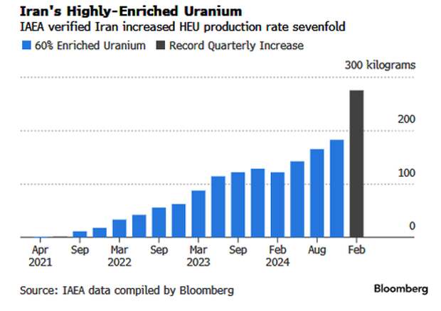Earlier, Bloomberg obtained a copy of a new IAEA report stating that Iran's uranium stockpile is nearing weapons-grade levels, with a 50% increase in enriched uranium over the past three months.