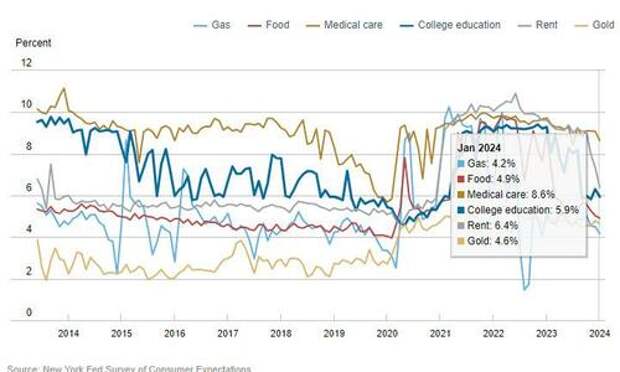 No central banker wants to be remembered as the policymaker that cut rates too soon and threw disinflationary pressures off course. That said, while Rabobank retains the forecast that the Fed’s first move is unlikely to be before June, there is still considerable market interest in a potential rate cut as soon as May. Today’s release of the US January CPI inflation data will provide the next test of how close the Fed is to achieving its goal of returning price pressures back to the 2% level and of reducing rates this spring. The market consensus stands at 2.9% y/y for the headline number, down from 3.4% y/y previously. The market median for the core CPI inflation number is 3.7% y/y down from 3.9% y/y. (ZH: The final number came in superhot compared to estimates and slammed shut the door on any early rate cuts).Yesterday’s release of the NY Fed’s survey of US consumer inflation expectations showed no movement over the 1- and 5-year horizons. These held at 3.5% y/y and 2.5% y/y respectively. However, expected inflation over 3 years dropped to 2.35% in January from 2.6% previously. This was the lowest in nearly 11 years.