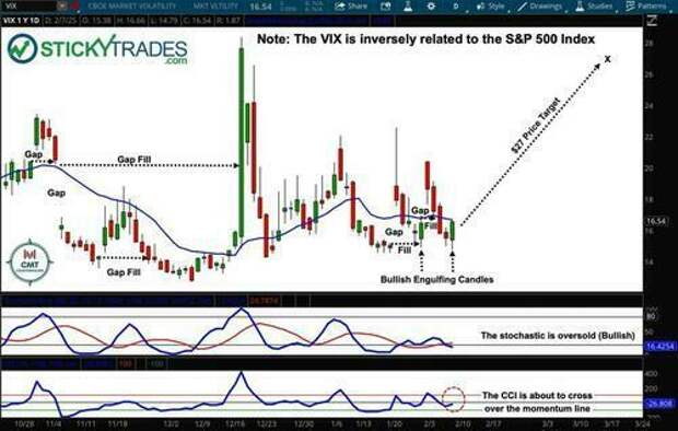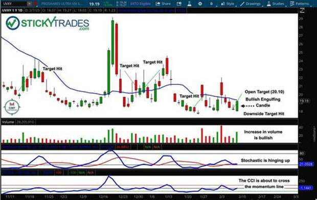 Monte is calling for at least $20.10 on UVXY (currently at $18.45) based on VIX technicals (which look bullish) and S&P technicals (bearish):