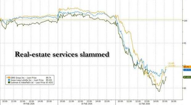 As the latest daily AI scare - this time focusing on real estate - hit the market, shares of CBRE Group Inc. plunged as much as 15%, Jones Lang LaSalle Inc. slid 13% and Cushman & Wakefield Ltd. fell 15%. For all three firms, the moves mark the biggest drop since March 2020 in the midst of the Covid-driven market selloff.