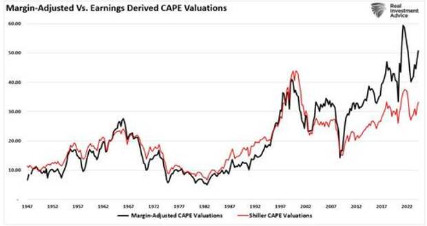 would be much higher than the standard CAPE shows – margin-adjusted measures of CAPE are around 50x today! If you believe in full reversion of both valuations and margins,then your return outlook would be exceptionally downbeat.”