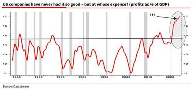 “Companies have been able to push through profit‑margin‑expanding price increases under the cover of two key events, namely 1) supply constraints in the aftermath of the Covid pandemic and 2) commodity cost-push pressures after Russia’s invasion of Ukraine. But we still emphasise that one of the main sources of the recent surge in profit margins is massive fiscal expansion. In short, the government has been spending more to the benefit of corporates.“