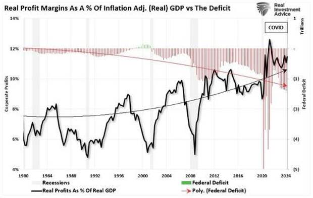 It is crucially important to understand the bolded statement above. Many economists and analysts are raising alarm bells about increasing government spending and deficits. However, over the past decade, record profit margins have become a hallmark of corporate America as politicians continue to “UN-save” by running more significant deficits. Therefore, corporate profit margins have averaged far higher than the historical norm, with both households and the government “dis-saving” at an increasing pace. From the aftermath of the 2008 financial crisis through the pandemic stimulus programs, fiscal policy has kept money flowing and profits robust.