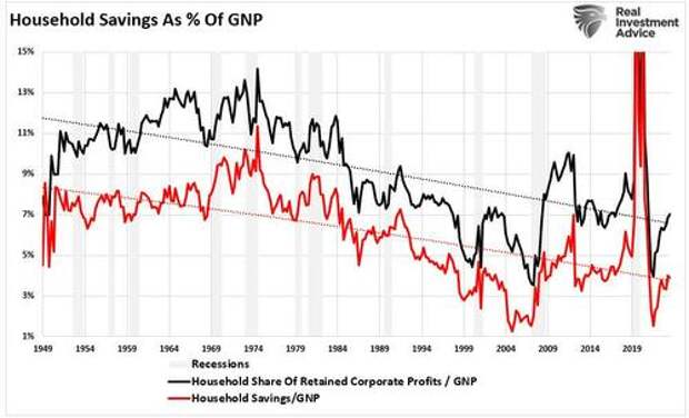 As shown, after a massive spike in household savings during the pandemic, the surge in corporate profitability was unsurprising as households went on a shopping spree.