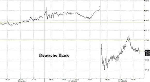 More importantly, as a result of the earnings fiasco, Germany’s largest bank also shelved plans for a second buyback this year as a previously disclosed litigation charge pushed it to the first quarterly loss since 2020. The shares plunged as much as 8.5% Wednesday, the steepest drop in almost three months, as the market realized it will no longer be frontrunning stock buying by the bank itself. They since recovered some losses, and were down 5.6% at last check, the worst performer among the large European lenders. BNP and UniCredit declined as well, with only Santander posting gains.
