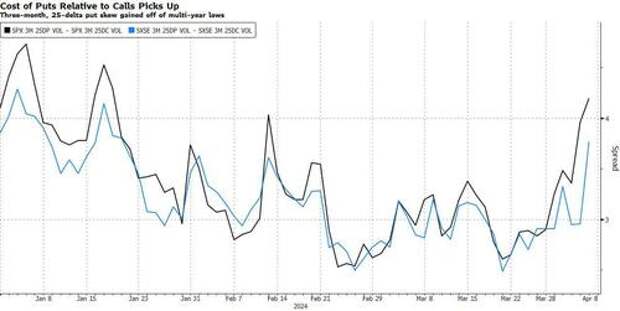 Indeed, buying and pricing of put options is picking up both in Europe and the US. Levels are certainly not extreme but the trend indicates investors are less complacent than before, as the timing of the first US interest-rate cut recedes further into the year.