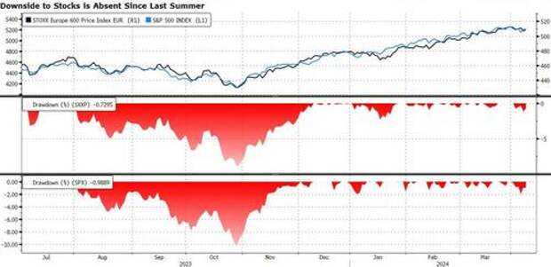 ” Both seem to be at play right now.Last Thursday’s equity drop was followed the next day by a 1% gain on Wall Street and a late-session bounce in the Stoxx 600. That fits the pattern we’ve seen since December — that of an uptrend punctuated with occasional drops, before markets to cruise back to record highs in a day or two.