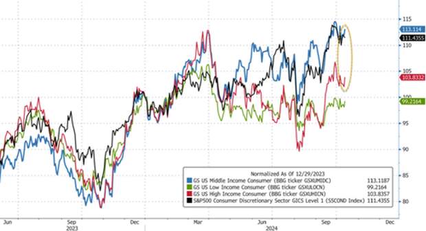 Looking at Goldman's consumer baskets, middle-income consumers are outperforming high-end consumers, while low-income consumers continue to face mounting pressure.
