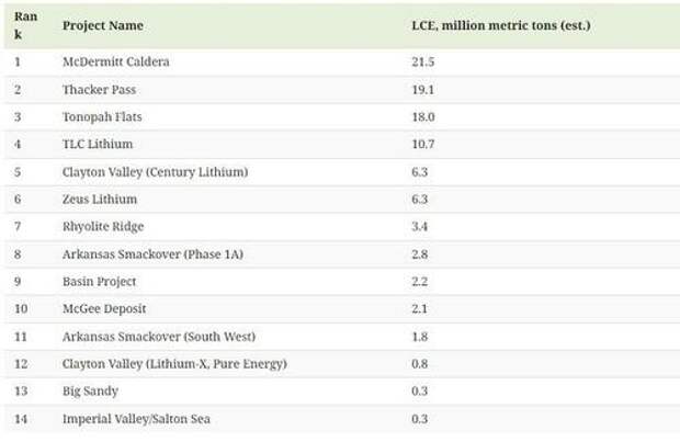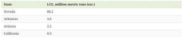 For each lithium resource, the potential volume of lithium carbonate equivalent (LCE) was calculated with a ratio of one metric ton of lithium producing 5.32 metric tons of LCE. Cumulatively, existing U.S. lithium projects contain 94.8 million metric tons of LCE.